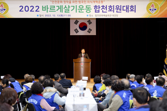 이날 1부 행사로 GCR 평생교육원 이동욱원장을 초빙하여 도덕성 회복 의식개혁 강연회를 실시하였고, 2부 합천회원대회에는 2022년 바르게살기운동 사업에 대한 성과보고와 유공 표창, 결의문 채택 등의 순으로 진행됐으며, 김윤철 합천군수와 조삼술 군의장 및 기관사회단체장이 참석하여 대회 개최를 축하해 주었다.