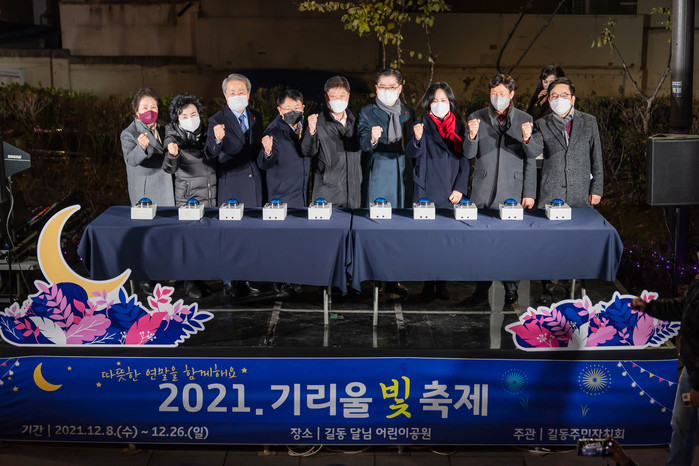 서울 강동구의 ‘2021 기리울 빛 축제’가 8일 개막했다. 축제는 오는 26일까지 열리며, 형형색색의 조명등으로 연출해 올해 말 겨울밤을 아름답게 수놓을 예정이다. 사진은 점등식 행사에 참석한 이정훈 구청장(오른쪽 네 번째)와 관계자들이 기념촬영을 하는 모습. (사진제공=강동구청)