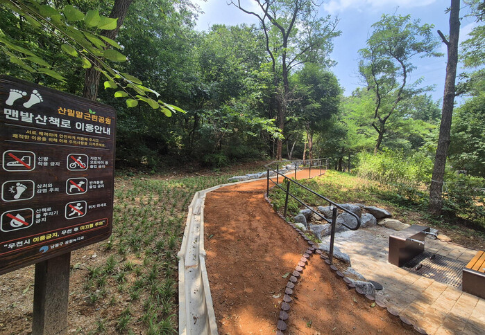새로 조성된 맨발 산책로는 총 길이 250m로 나무 그늘 아래 산비탈을 따라 걷는 순환형 코스이다. 촉촉한 황토를 밟고 오르면 중간 목교로 연결해 공원 최상단 체력단련장 주변을 돌아 다시 내려올 수 있도록 설계됐다.