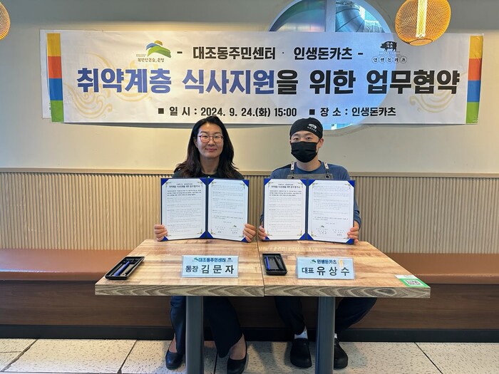 [시민일보 = 이대우 기자] 은평구(구청장 김미경) 대조동은 최근 관내 음식점 인생돈카츠와 취약계층 식사 지원을 위한 업무협약을 체결했다고 밝혔다.