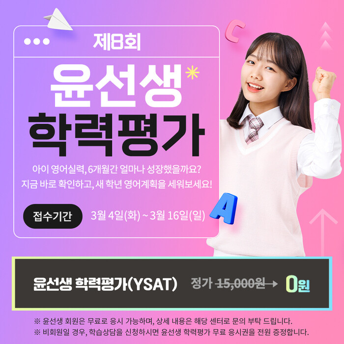 영어교육 전문기업 윤선생은 오는 17일부터 전국 윤선생 회원을 대상으로 '제8회 영어 학력평가'를 실시한다. 온라인으로 치르는 윤선생 학력평가(YSAT)는 ▲파닉스·어휘 ▲듣기·말하기 ▲읽기·쓰기 영역의 성취도를 다각도로 측정할 수 있는 전국 단위의 영어능력 평가시험이다. 윤선생 학력평가는 2021년부터 매년 2회 실시되고 있으며, 지난 회차까지 11만 3천 명이 응시했다고 윤선생 관계자는 덧붙였다.