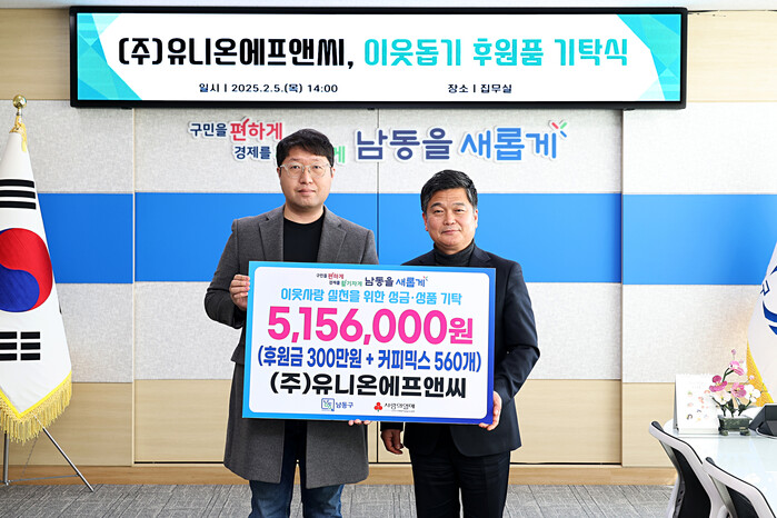 ㈜유니온에프앤씨는 남동국가산업단지에 소재한 커피믹스, 핫초코 등 자판기용 분말 생산·납품업체로 남동구에 후원금 300만 원과 커피(215만 원 상당)를 기탁했다.