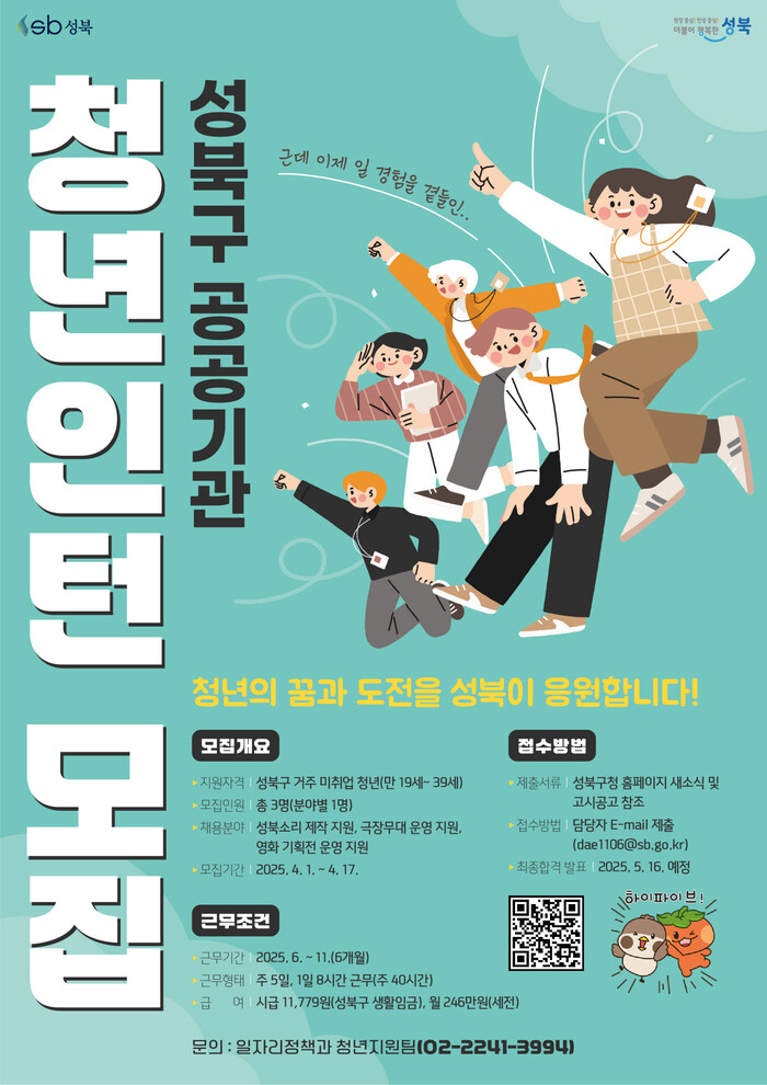 이번 사업은 ▲구청 홍보전산과(성북소리 제작 지원) ▲꿈빛극장(극장무대 운영 지원) ▲아리랑시네센터(영화 기획전 및 영화제 운영 지원) 등 3개 분야에서 각 1명씩 총 3명을 선발할 예정이다.
