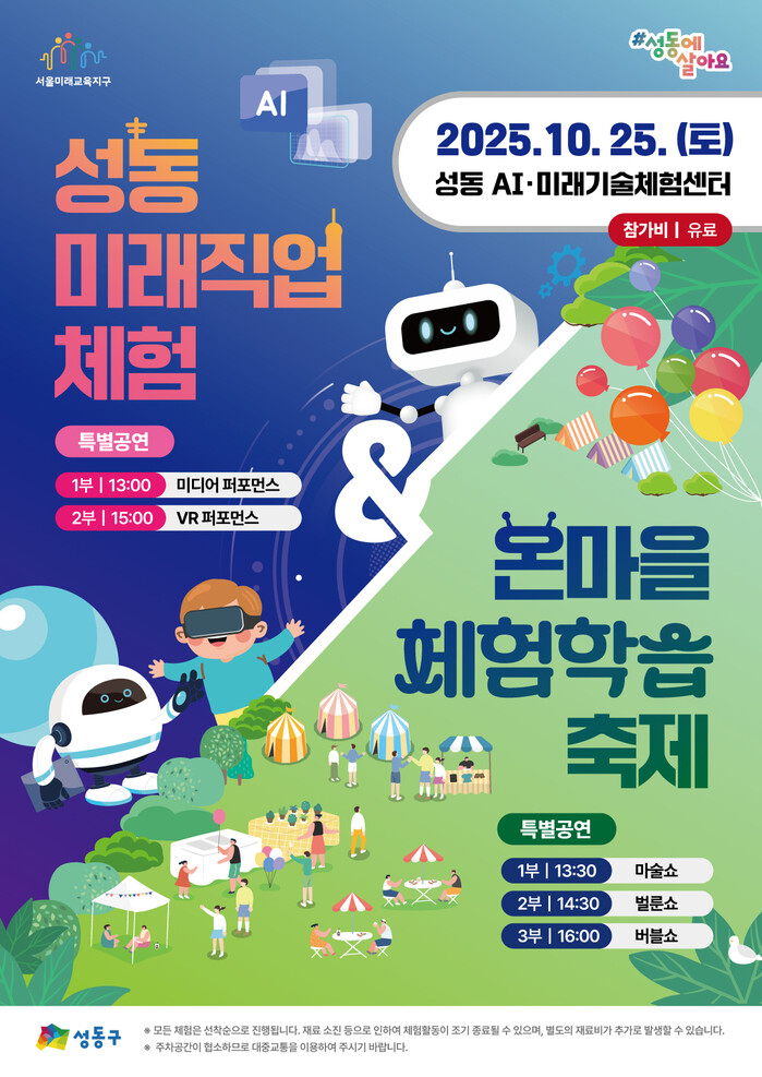 [시민일보 = 박소진 기자] 성동구(구청장 정원오)가 오는 25일 성동 AI‧미래기술체험센터 일대에서 '성동 미래직업체험 & 온마을체험학습 축제'를 개최한다고 밝혔다.