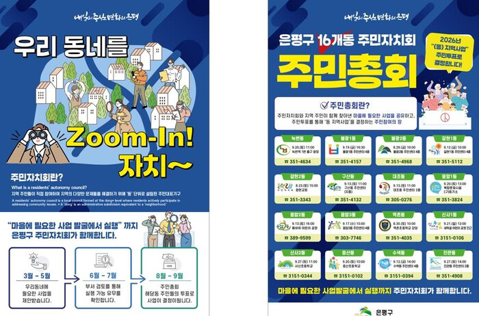 [시민일보 = 이대우 기자] 은평구(구청장 김미경)는 23일부터 9월27일까지 16개 동주민센터에서 ‘2025년 은평구 주민자치회 동 주민총회’를 개최한다고 밝혔다.