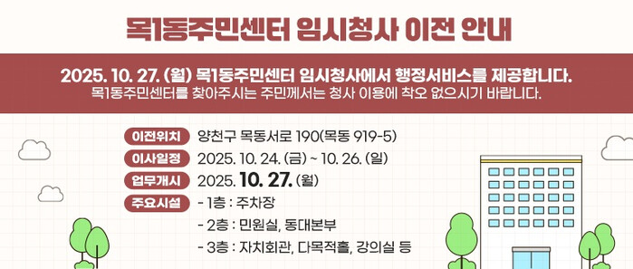 [시민일보 = 박소진 기자] 양천구(구청장 이기재)는 건립 후 35년이 지나 노후화된 목1동 주민센터 신축을 추진하기 위해, 오는 27일부터 임시청사로 이전해 업무를 개시한다고 밝혔다.