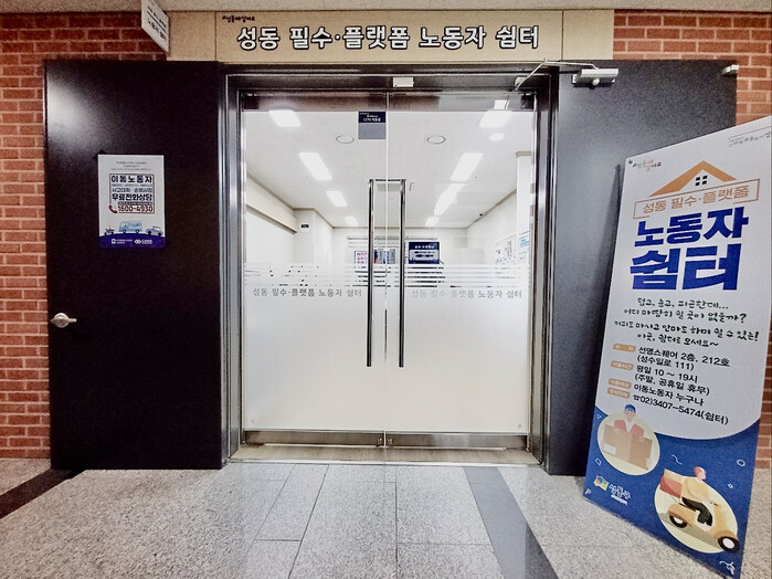 ‘성동 필수·플랫폼 노동자 쉼터’(성수일로111, 212호)는 필수노동자를 비롯해 배달원, 택배기사 등 이동노동자 누구나 근무 중 대기하거나 쉴 수 있는 쉼터로 2023년 7월 개소했다.