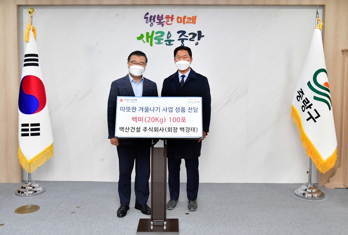 서울 중랑구는 8일 백산건설 주식회사로부터 2022 희망온돌 따뜻한 겨울나기 성품으로 백미(20kg) 100포(554만원 상당)를 전달받았다. 전달된 성품은 서울사회복지공동모금회를 통해 지역내 어려운 이웃을 위해 사용될 예정이다. 사진은 전달식에서 류경기 구청장과 백경태 회장이 기념촬영을 하는 모습. (사진제공=중랑구청)
