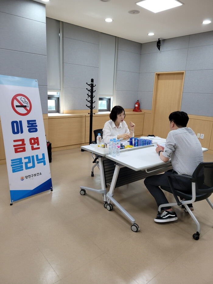 | ▲ 양천구 이동식 금연클리닉 프로그램에 참여해 상담을 받고 있는 모습. (사진=양천구청 제공) |