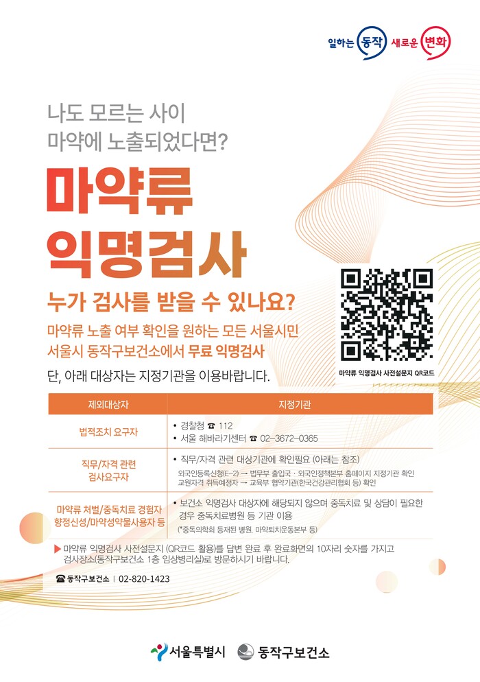 [시민일보 = 여영준 기자] 동작구(구청장 박일하)는 마약범죄 피해 확산을 조기에 차단하고자 ‘마약류 익명검사’ 를 도입해 지난 10일부터 시행 중이라고 밝혔다.