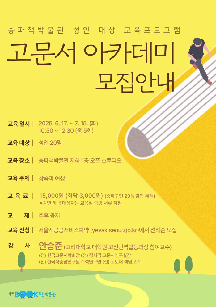 수업 일정은 매주 화요일 오전 10시30분부터 2시간가량 진행된다. 고전에 관심 있는 성인 누구나 송파책박물관 누리집에서 선착순 신청하면 된다. 수강료는 5회 총 1만5000원이다.