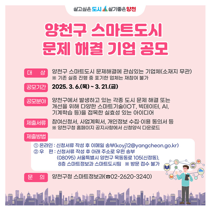 [시민일보 = 박소진 기자] 양천구(구청장 이기재)는 우수한 기술력과 창의적인 아이디어를 보유한 기업에게 신기술 검증 기회를 제공하고, 이를 구정에 반영해 도시경쟁력과 생활 편의성을 확보하고자 오는 21일까지 ‘스마트도시 기업 아이디어 공모’를 진행한다고 17일 밝혔다.