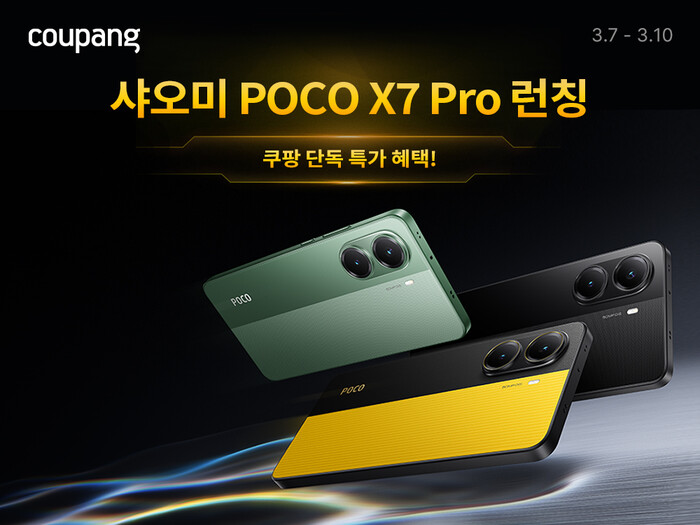 [시민일보 = 문민호 기자] 쿠팡이 샤오미의 최신 프리미엄 스마트폰 '포코 X7 프로(POCO X7 Pro)’ 사전판매를 시작했다고 밝혔다. 사전판매 마지막 날인 10일 진행 예정인 ‘쿠팡라이브’ 방송을 통해 구매하는 고객에게는 최대 8만원 할인 혜택을 제공한다.