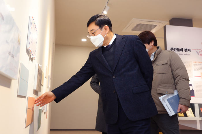 이동진 도봉구청장은 최근 편지문학관(도봉로 552)을 찾아 전시실 미디어콘텐츠와 디지털편지, 도봉의 인물들 등 편지콘텐츠, 프로그램실 조성 현장 등을 둘러보고 점검했다. 사진은 이 구청장(앞쪽)이 현장 관계자들과 함께 현장을 둘러보고 있는 모습. (사진제공=도봉구청)