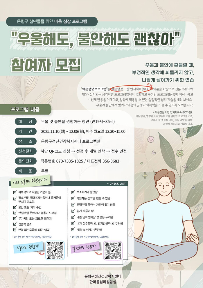[시민일보 = 이대우 기자] 서울 은평구(구청장 김미경)는 청년들의 마음 성장 프로그램인 ‘우울해도, 불안해도 괜찮아’ 참여자를 모집한다.