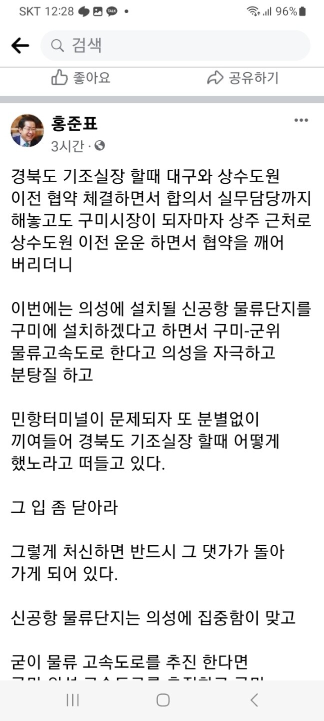 이에 22일 홍 시장은 날선 목소리로 제발 “그 입좀 닫으라고” 했다.상수도 이전 협약을 깨어 버리고 이번에는 의성에 설치할 신공항 물류단지를 구미에 설치하겠다고 하면서 구미-군위 고속도로 한다고 의성을 자극하고 분탕질 하고 민항터미널이 문제되자 또 분별없이 끼여들어 경북도 기조실장할때 어떻게 했노라고 떠들고 있다고 했다.