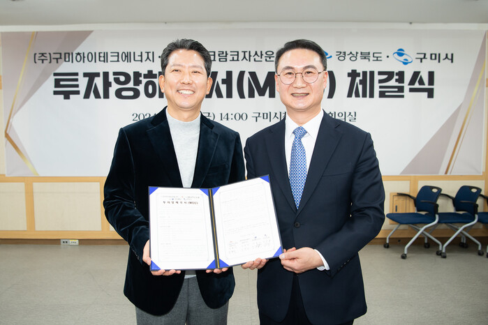 [구미=박병상 기자] 구미시는 지난 13일 시청에서 이철우 경북도지사, 김장호 구미시장, 박교상 구미시의회 의장, ㈜구미하이테크에너지 김병선 대표이사, ㈜코람코자산운용 박형석 대표이사 등이 참석한 가운데 구미하이테크밸리(5산단 1단계)에 AI데이터센터와 수소연료전지발전소를 결합한첨단 복합시설 건설을 위한 투자양해각서(MOU)를 체결했다고 밝혔다.