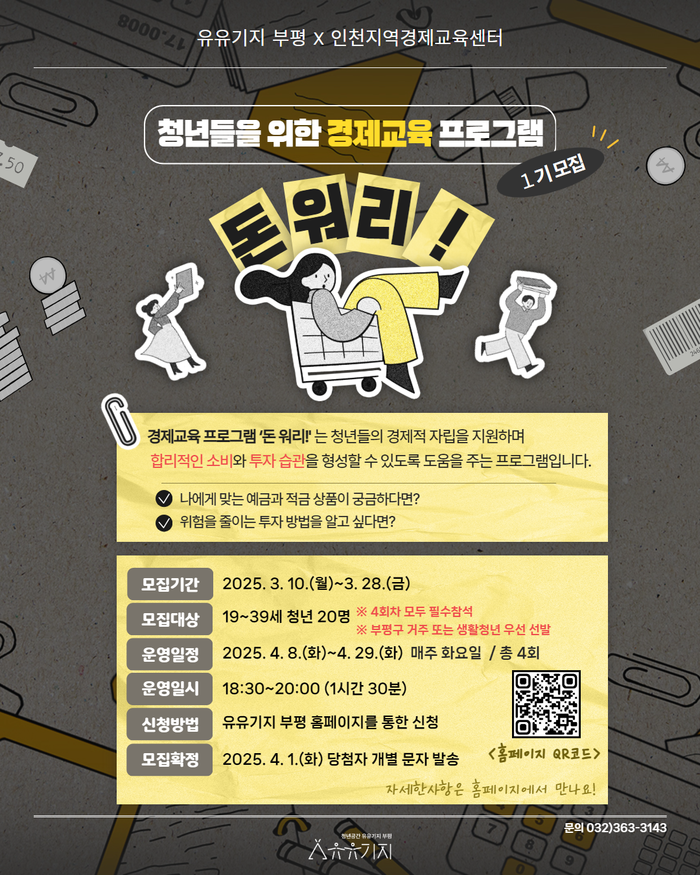 [인천=문찬식 기자] 인천 부평구(구청장 차준택) 청년공간 유유기지 부평은 오는 28일까지 청년들의 경제·금융 지식을 높이기 위한 경제교육 프로그램 ‘돈 워리!’ 참가자를 모집한다.