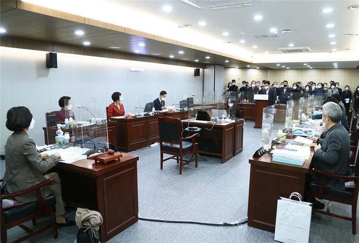 서울 송파구의회가 최근 구청 3·4층에 설치된 행정사무감사장에서 상임위별 2021년도 행정사무감사에 돌입했다. 사진은 도시건설위원회가 송파구청 3층 기획상황실에서 소관부서 국·과장의 선서를 받고 있는 모습. (사진제공=송파구의회)