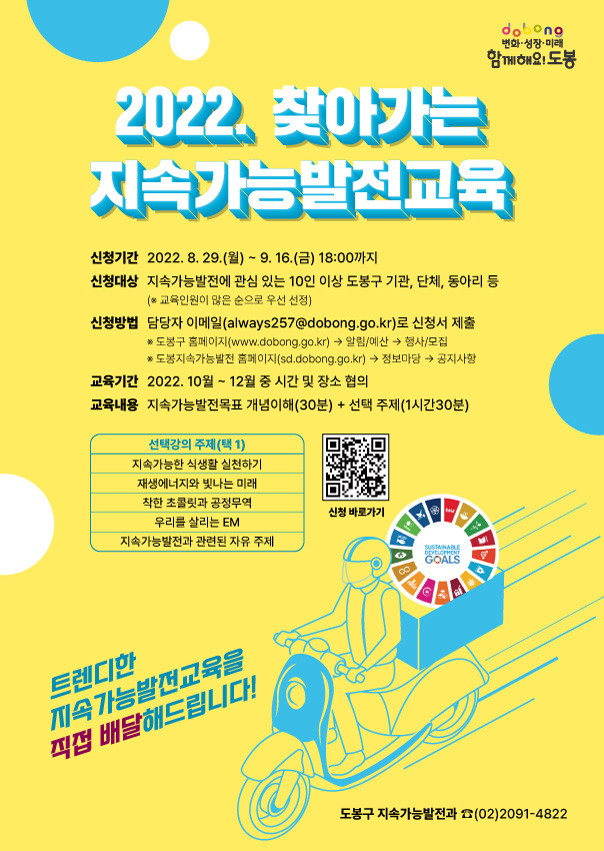 [시민일보 = 박준우 기자] 도봉구(구청장 오언석)는 '찾아가는 지속가능발전교육' 수강 단체(팀)를 오는 29일부터 9월16일까지 모집한다.
