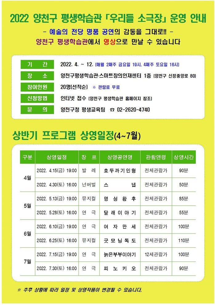 교육지원과 관계자는 “예술의 전당 명품 공연이 주는 감동을 가까운 우리 동네에서 느낄 수 있도록 ‘우리들 소극장’을 개최한다”면서 “대형 스크린을 통해 실제 공연장에 와 있는 듯한 생생한 현장감을 제공할 예정이니 관심 있는 구민 여러분의 많은 신청 바란다”고 말했다.