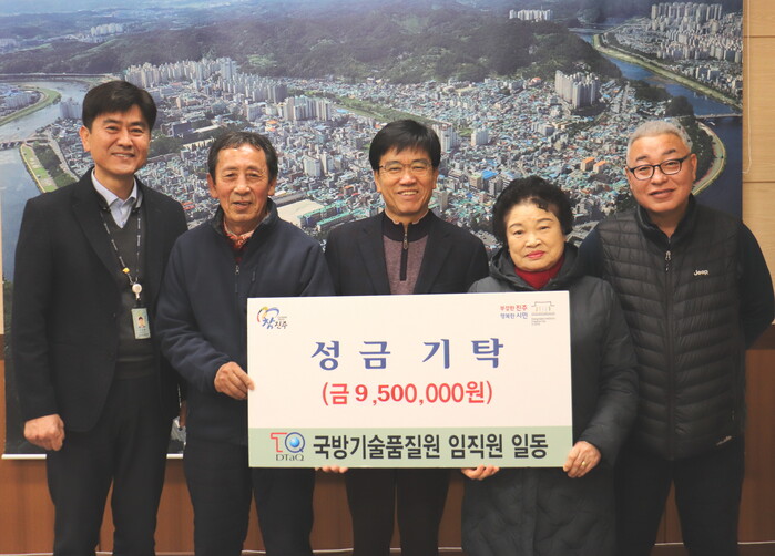 국방기술품질원(원장 허건영) 임직원들은 6일 설맞이 사랑나눔행사를 통해 마련한 모금액 950만 원을 관내 어려운 이웃돕기에 써 달라며 진주시복지재단(이사장 이성갑)에 기탁했다.