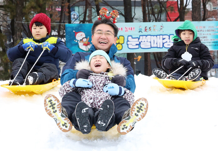 | ▲ 오승록 구청장이 지난 23일 오전 서울 노원구 서울과학기술대학교 종합운동장에 열린 ‘노원 씽씽 눈썰매장’을 찾은 어린이들과 즐거운 시간을 보내고 있다. (사진=노원구청 제공) |