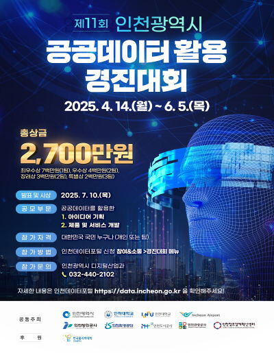 [인천=문찬식 기자] 인천광역시(시장 유정복)는 공공데이터를 활용한 혁신적인 아이디어와 창의적인 비즈니스 모델을 발굴하기 위해 ‘제11회 인천광역시 공공데이터 활용 경진대회’를 개최한다고 밝혔다.