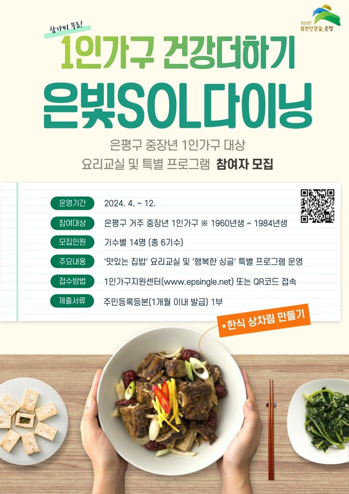 ‘은빛SOL다이닝’은 중장년 1인가구를 대상으로 요리교실과 특별프로그램이 내달부터 12월까지 운영된다. 요리교실은 친환경 제철 식재료를 활용한 한식 위주의 상차림 및 건강 특식 만들기를 주제로 진행된다. 특별프로그램은 식단 관리 교육 및 필라테스, 요가 등 건강프로그램으로 구성된다. 내달 1일부터 은평구 1인가구지원센터 누리집과 모아폼을 통해 참여자를 모집한다.