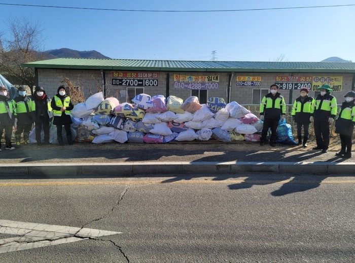 경기 남양주시 새마을교통봉사대남양주시지대는 6일 별내면 청학리에서 무단 투기 제로를 위한 환경 정화 활동을 진행했다. 이날 참여자들은 6시간 동안 무단 투기된 쓰레기 약 2.5톤 분량을 모두 수거했다. 사진은 참여자들이 기념촬영을 하는 모습. (사진제공=남양주시청)