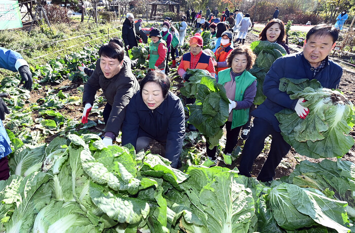이번 행사에는 김장철을 맞아 갈산1동 새마을부녀회와 십정1동 지역사회보장협의체 등 80여 명이 참여해 갈월샘텃밭에서 친환경농법으로 재배한 배추 990포기와 무 1천500㎏을 직접 수확했다.
