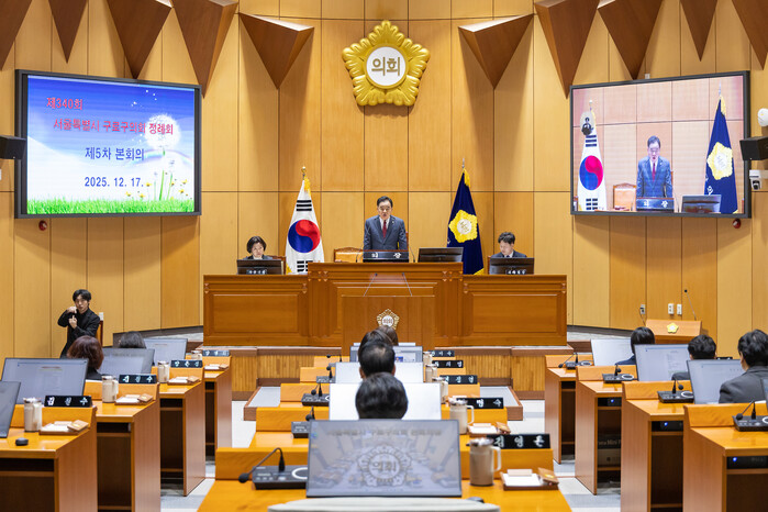 [시민일보 = 박소진 기자] 서울 구로구의회(의장 정대근)는 지난 17일 제340회 정례회 제5차 본회의를 열고 총 1조538억6000만원 규모의 2026년 구로구 예산을 최종 확정하며 21일간의 의사일정을 마무리 했다고 밝혔다.