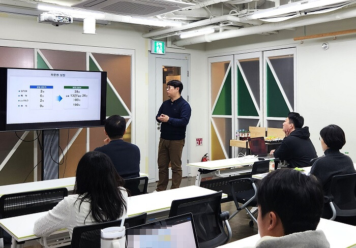 | ▲ 에이엔폴리가 서울소셜벤처허브 제2회 타운홀 미팅에서 우수 성과를 공유하고 있다. (사진=서울소셜벤처허브 제공) |