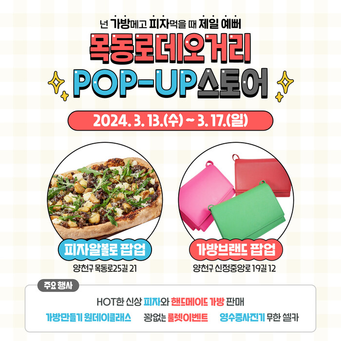 [시민일보 = 이대우 기자] 양천구(구청장 이기재) 목동역 인근 목동로데오거리 공실 점포 두 곳에서 13~17일 5일간 ‘피자와 가방’을 주제로 로컬브랜드가 참여하는 ‘체험형 팝업스토어’가 열린다.