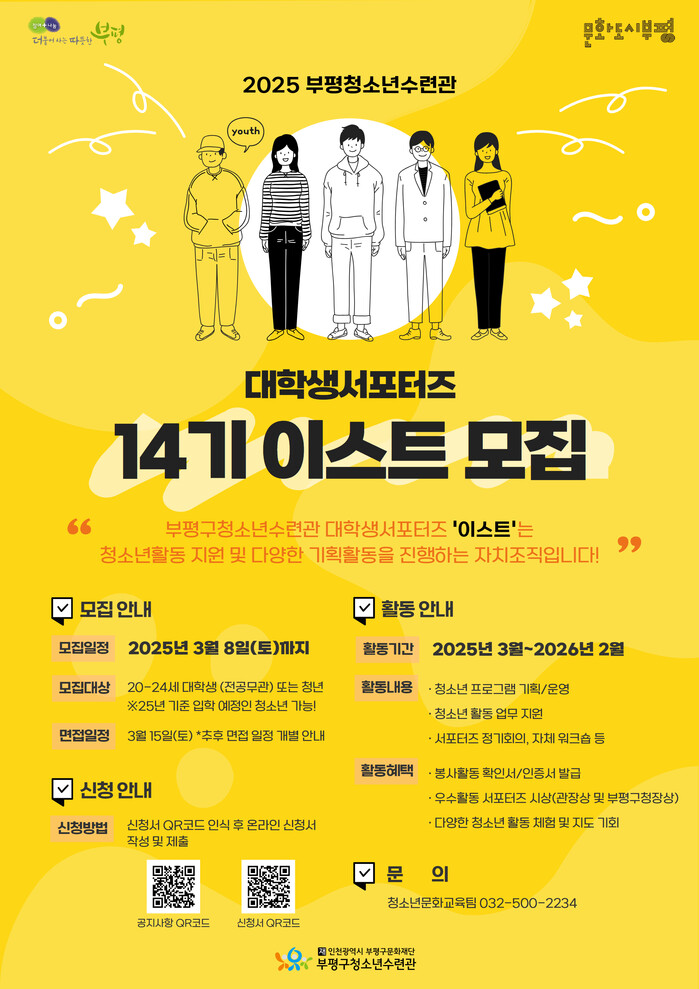 [인천=문찬식 기자] 인천 부평구(구청장 차준택) 청소년수련관이 2025년 제14기 대학생 서포터즈 ‘이스트’의 신규 위원을 모집한다고 밝혔다.