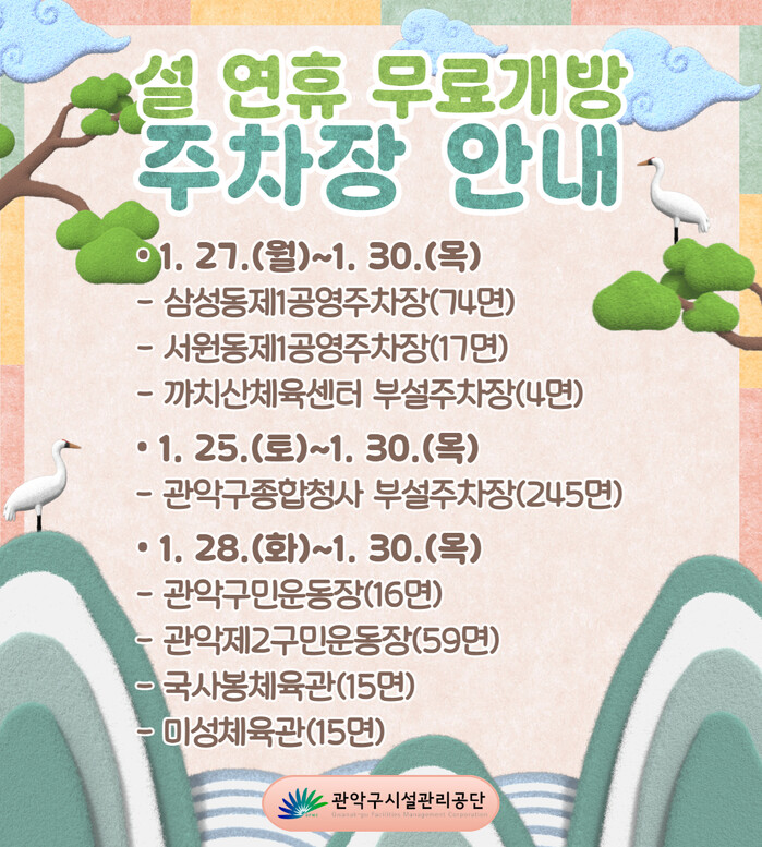 1월 27일부터 1월 30일까지 ▲삼성동제1공영 ▲서원동제1공영 ▲까치산체육센터 부설주차장을, 1월 28일부터 1월 30일까지 ▲관악구민운동장 부설 ▲관악제2구민운동장 부설 ▲국사봉체육관 부설 ▲미성체육관 부설주차장을 무료개방 한다.