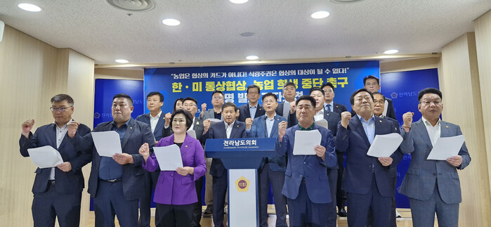 [남악=황승순 기자]전라남도 의회는 17일 도의회 브리핑룸에서 “최근 한미 통상 협상과 관련해 농업분야가 다시금 협상의 희생량이 되는 것을 강력히 반대하며 향후 통상 협상과정에서 우리농업을 굳건희 지킬 것”을 촉구하고 나섰다.