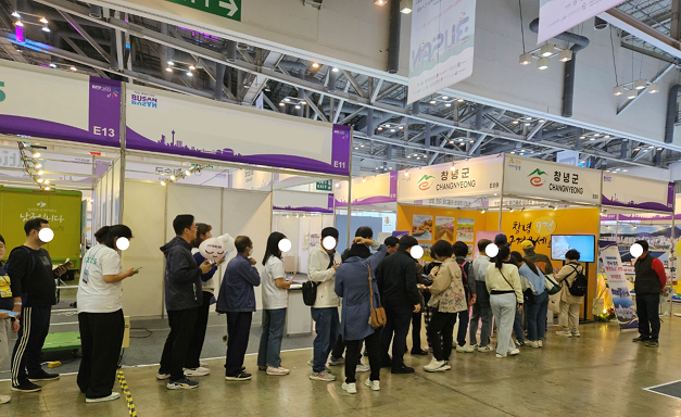 | ▲ 사진설명:관람객들이 창녕군에서 마련한 참여 이벤트에 참가하기 위하여 창녕군 홍보 부스 앞에 줄을 서있다. |