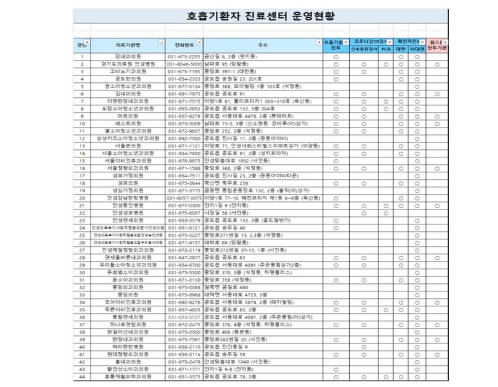 이와 관련해 안성시 관내에서 호흡기환자진료센터로 운영 중인 병·의원 내역은 건강보험심사평가원 누리집(알림-심평정보통)이나 네이버, 다음 등 포털사이트에서 확인할 수 있다.