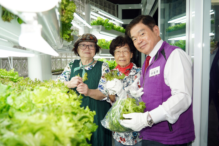 | ▲ 노인들과 함께 스마트팜에서 자란 채소를 수확하고 있는 이필형 구청장(오른쪽). (사진=동대문구청 제공) |