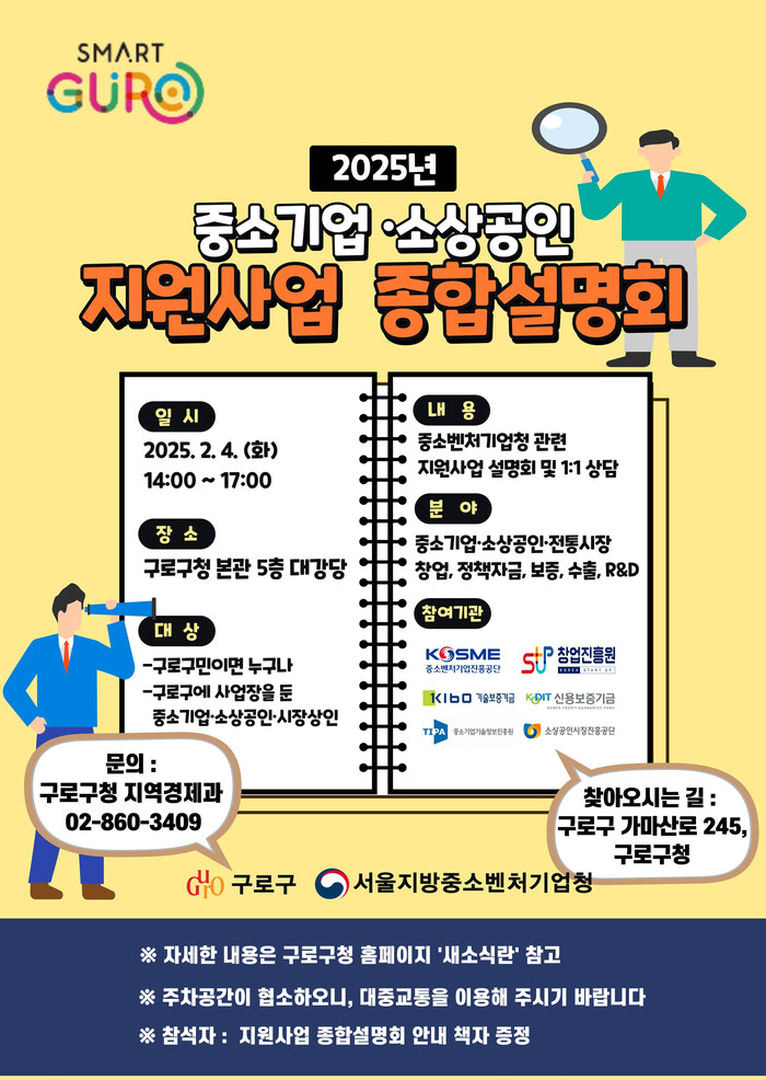 [시민일보 = 박소진 기자] 구로구(구청장권한대행 엄의식)가 오는 2월4일 오후 2시부터 5시까지 구청 대강당에서 ‘2025 중소기업·소상공인 지원사업 설명회’를 개최한다고 밝혔다.