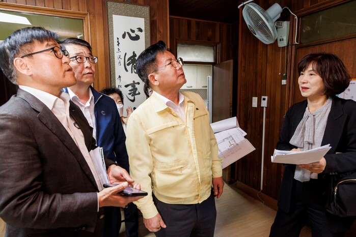 | ▲ 지난 5월 박강수 구청장(가운데)이 무더위쉼터로 운영되는 희우경로당을 찾아 시설을 점검하고 있다. (사진=마포구청 제공) |
