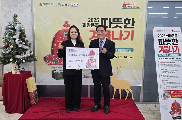 [시민일보 = 이대우 기자] 은평구(구청장 김미경) 녹번동은 최근 사회적기업 주식회사 명성학원으로부터 따뜻한 겨울나기 성금 100만원을 전달받았다고 밝혔다.