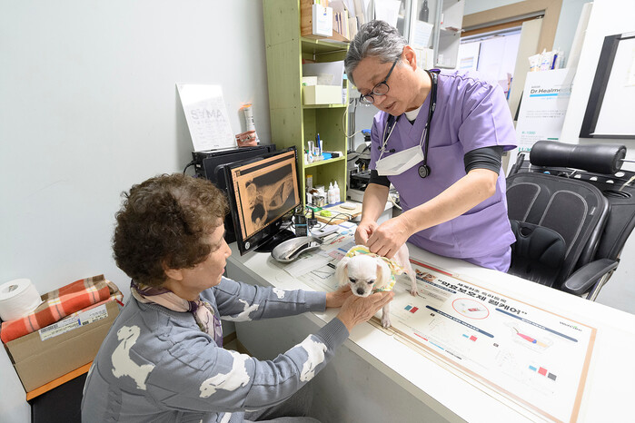 | ▲ 양천구 ‘우리동네 동물병원’에서 진료를 받고 있는 반려견과 구민가족. (사진=양천구청 제공) |