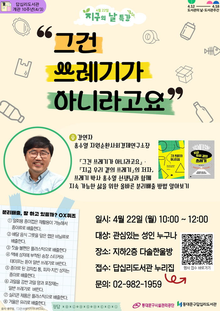 [시민일보 = 이대우 기자] 서울 동대문구시설관리공단에서 운영하는 동대문구답십리도서관이 4월 22일 지구의 날을 맞이하여 홍수열 자원순환사회경제연구소장과 함께하는 환경보호 특강 “그건 쓰레기가 아니라고요” 강연을 진행한다.