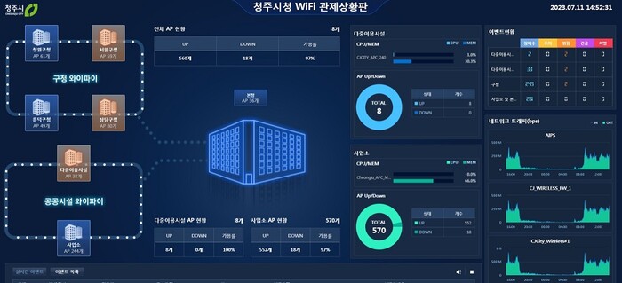 공공와이파이 통합관제시스템은 장소별 공공와이파이 사용량 및 접속자 수, 장애 발생 등 관내 공공와이파이 상태를 실시간으로 모니터링할 수 있는 시스템이다.