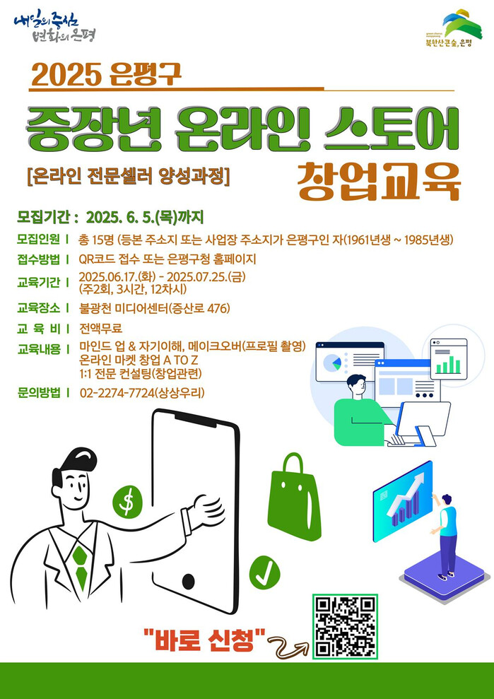 교육 대상은 은평구 거주 중인 40세부터 64세까지의 중장년이며, 온라인 창업에 관심 있는 누구나 신청할 수 있다.