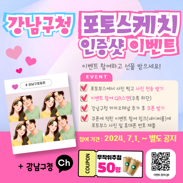 구는 포토스케치 인증샷 이벤트를 진행한다. 사진을 찍고 강남구청 카카오 채널을 추가하면 카카오톡으로 이벤트 참여 쿠폰이 전송된다. 이 쿠폰에 있는 참여 링크로 사진과 전화번호를 제출하면 무작위 추첨을 통해 50명에게 커피 쿠폰을 제공한다. 이벤트는 7월 1일부터 시작해 별도 공지 시까지 계속 진행할 계획이다.