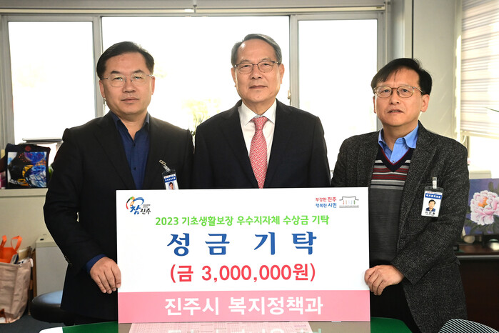 진주시, 기초생활보장분야 포상금 진주시 복지정책과는 보건복지부 주관 ‘2023년도 기초생활보장 분야 평가’에서 우수지자체로 선정되어 받은 포상금 300만 원 전액을 복지재단에 기탁했다.