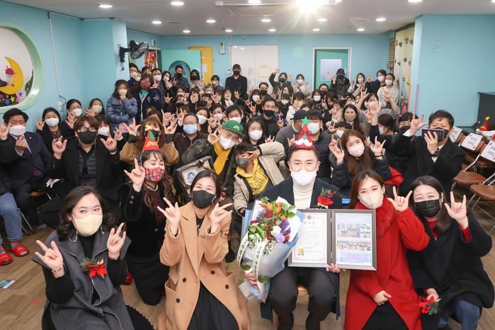 | ▲ 창4동어린이집 관계자들로부터 감사장을 전달 받은 오언석 구청장(앞줄 오른쪽 세 번째)이 기념촬영을 하고 있다. (사진제공=도봉구청) |